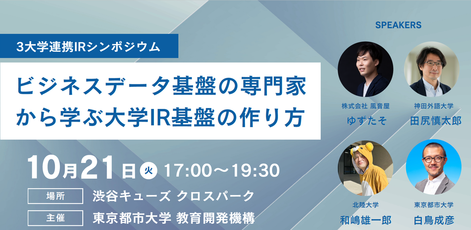 SHIBUYA QWS Innovation 協議会、東京都市大学 教育開発機構、北陸大学、神田外語大学が主催する「3大学連携IRシンポジウム ビジネスデータ基盤の専門家から学ぶ大学IR基盤の作り方」に、当社代表・横山(ハンドルネーム:ゆずたそ)が登壇し、基調講演を行います。