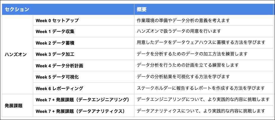 リーダーとして一人前の活躍ができるように、基礎知識のインプットと実践課題のアウトプットを大量にこなします。ビジネススクールの「データ分析」「データ基盤」バージョンだとお考えください。