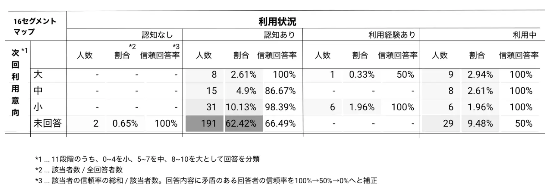 各ソリューションごとに、利用状況を「認知なし」「認知あり」「利用経験あり」「利用中」の4つで、次回利用意向を「大」「中」「小」「未回答」の4つで表し、これらの組み合わせで回答者を16種類のセグメントに分けて可視化した。
