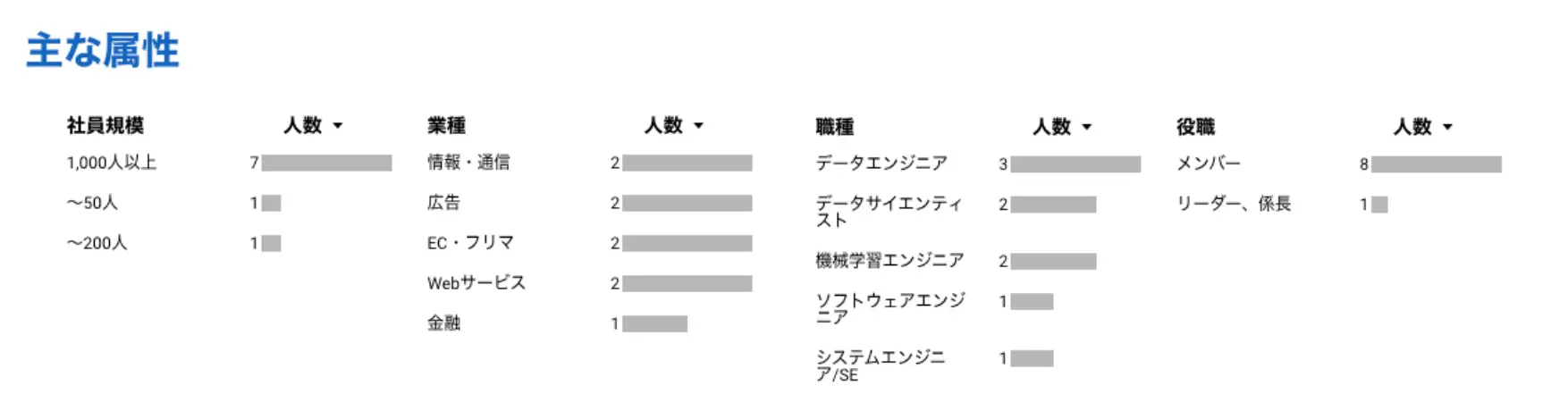 各セグメントについて、回答者の主な属性・意見を可視化した。属性としては「社員規模」「業種」「職種」「役職」を、意見としては「採用理由」「継続理由」「離脱理由」「改善要望」を取り上げた。